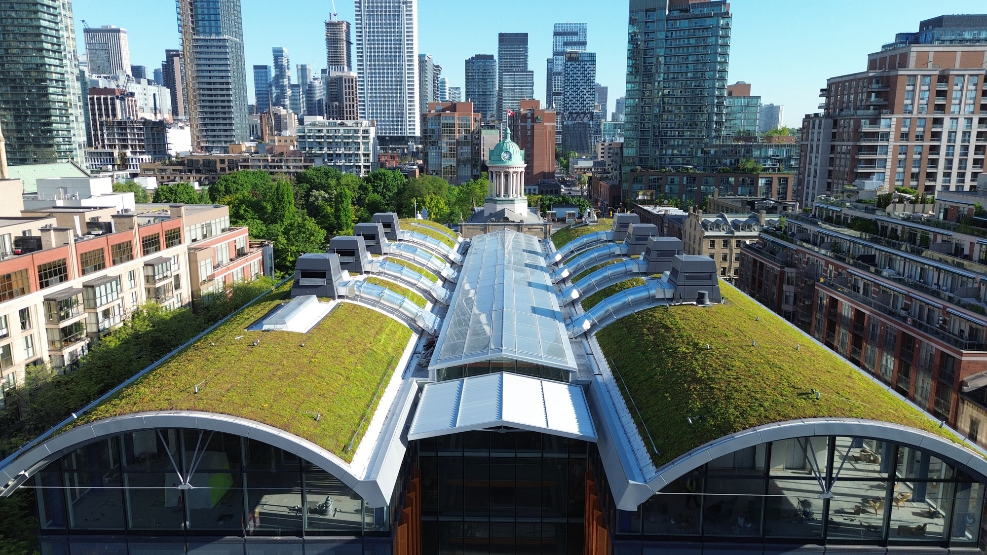 eine Zisterne speist. Das St. Lawrence Market North in Toronto beeindruckt mit seinen spektakulären Tonnendachbegrünungen. Auf den steilen, bis zu 45° geneigten Dachflächen sorgen innovative Systemaufbauten und präzise verankerte Schubhalter für Stabilität und Erosionsschutz, während 17 Sedum-Arten die Flächen in üppiges Grün tauchen. Das Projekt vereint anspruchsvolles Design, technische Präzision und nachhaltige Begrünung auf beeindruckende Weise.