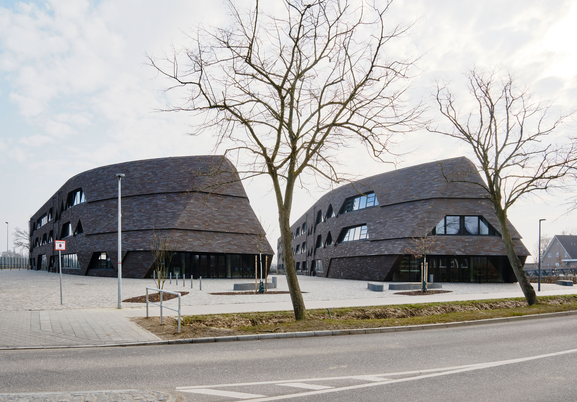 In den flachen Vierlanden nahe Hamburg greift die Stadtteilschule Kirchwerder historische „Langhäuser“ auf und übersetzt deren Giebelform in moderne Baukörper. Die Fassaden aus Petersens Tegl „Cover“ verbinden rote, braune, blaue und gelbe Töne zu einer lebendigen, regional verwurzelten Oberfläche, die sowohl die traditionelle Backsteinlandschaft als auch die komplexen, doppelt gekrümmten Formen der Schulgebäude harmonisch aufgreift.