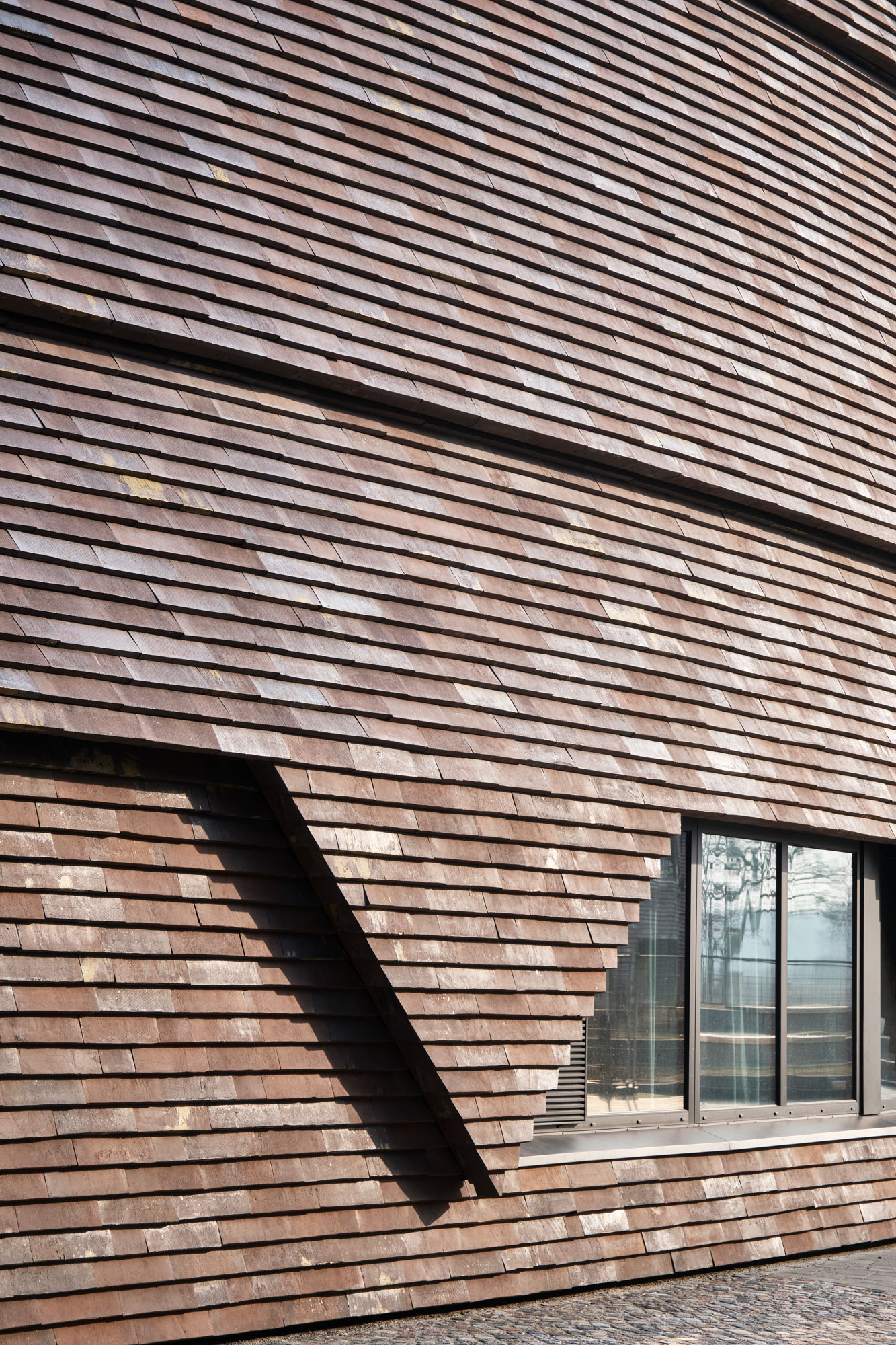 Die Gebäude sind vollständig mit großen Fassadenziegeln ummantelt. Die Fassade aus dem Material „Cover“ der Firma Petersen Tegl zeigt eine reiche Palette von Rot-, Braun-, Blau- und Gelbtönen, die die Vielfalt der historischen Backsteinfassaden in der Region widerspiegelt. Die Verwendung von Cover für die Fassaden ergibt ein sehr harmonisches Bild mit der lokalen Tradition des Reetdachbaus. Darüber hinaus ermöglichte Cover eine reibungslose Ausführung der doppelt gekrümmten Oberflächen der Fassaden, ohne dass dabei Übergänge entstanden.
