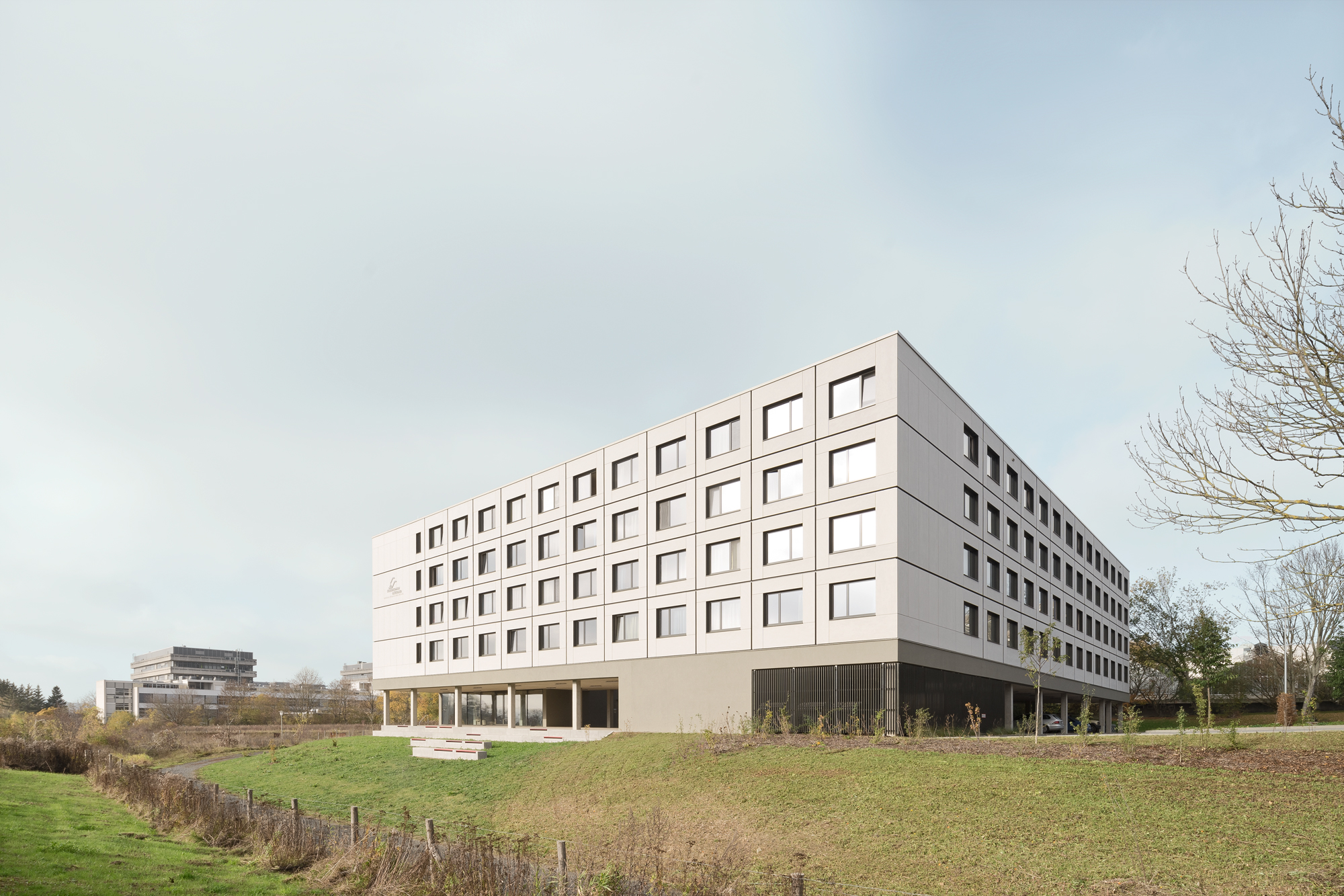 Das Wohnheim Lutterterrasse (wa-2014546) auf dem Nordcampus der Universität Göttingen ist als baulicher Abschluss zur Grünzone des Campus gedacht. Die Fassade wurde mit rund 3.400 qm Equitone [tectiva] TE 90 Tafeln aus Faserzement bekleidet. Die matt geschliffenen, weiß durchgefärbten und unbeschichteten Tafeln nehmen mit ihren geschosshohen Formaten das Modulraster an der Fassade auf und verleihen dem Gebäude mit ihrer natürlichen Haptik ein ruhiges, homogenes Erscheinungsbild. Funktional überzeugt das Material durch seine Witterungsbeständigkeit, Formstabilität und Langlebigkeit.