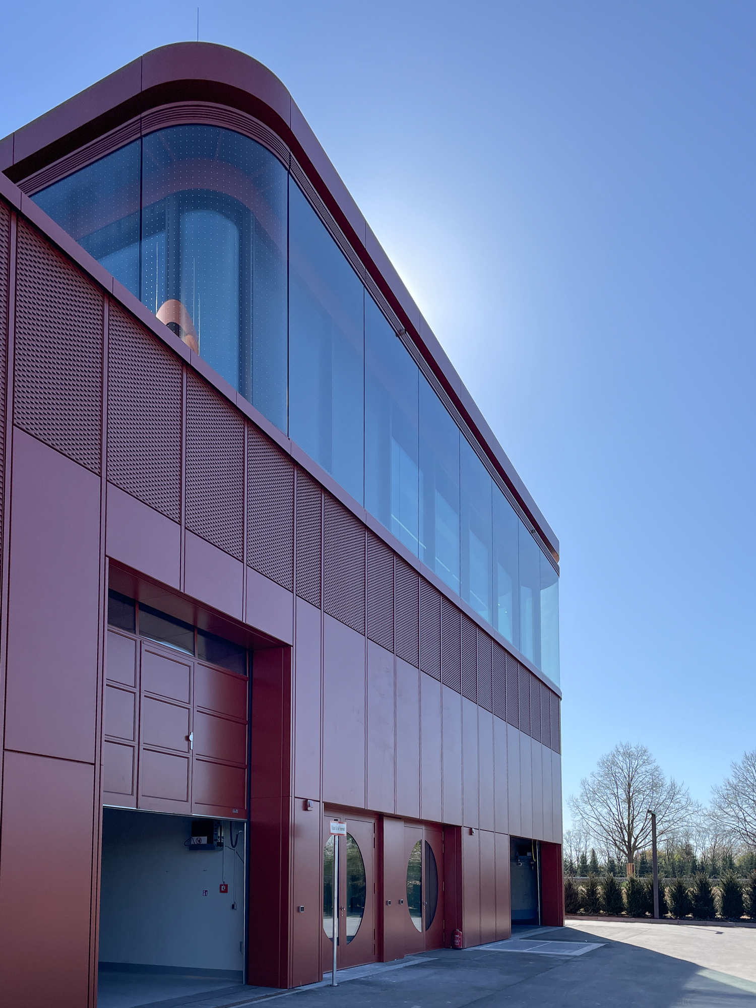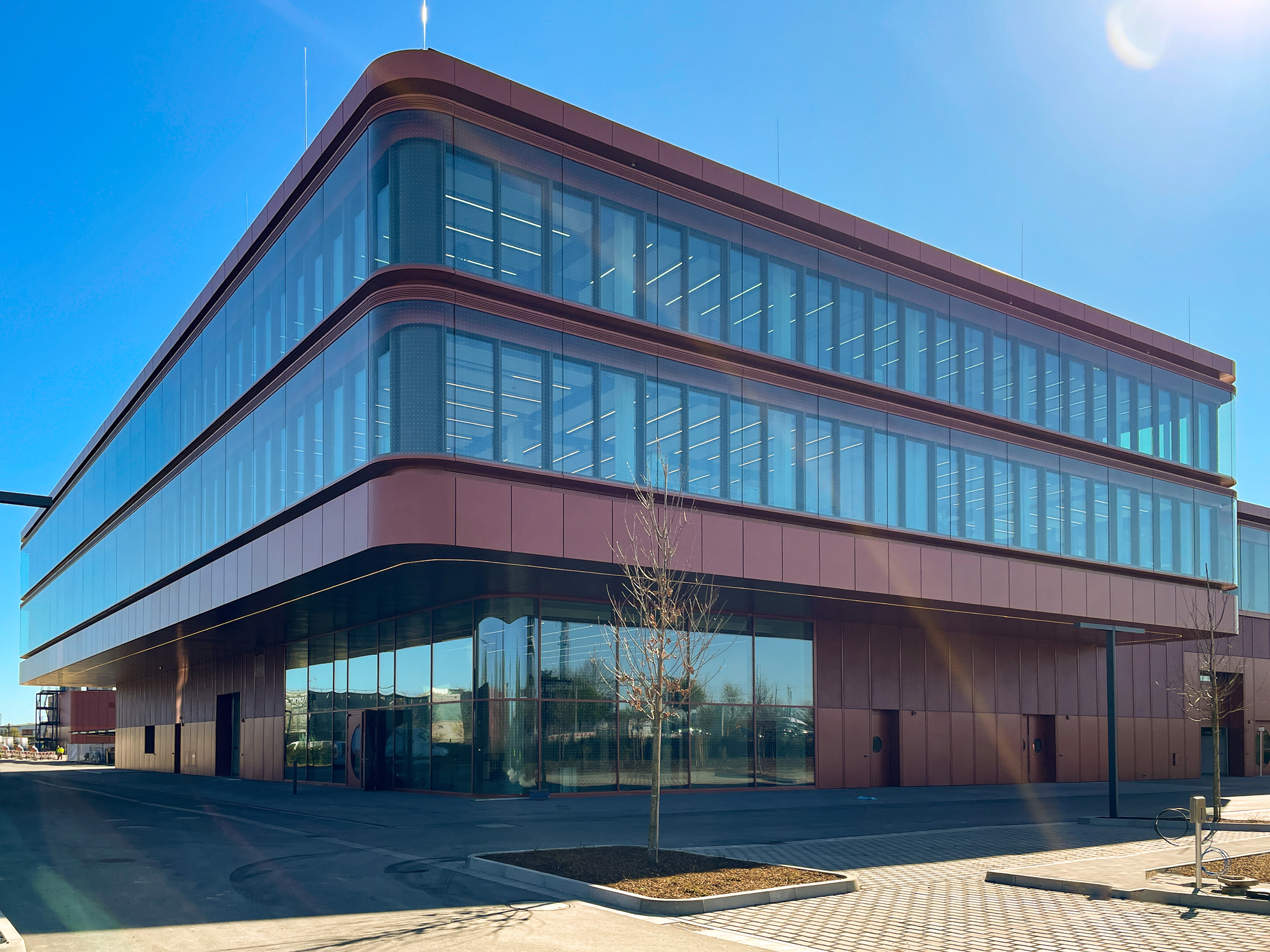 Mehrere Sonderlösungen verdeutlichen den hohen Individualisierungsgrad des Projekts: gekrümmte Eckelemente in Blech- und Doppelfassade, ein komplett maßgeschneidertes Pförtnerhaus sowie ein separater Pavillon mit runden Fensterelementen und eigens angepasstem Rund-Sonnenschutz. Auch die Elementfassade wurde als projektspezifische Sonderkonstruktion neu entwickelt und geprüft.