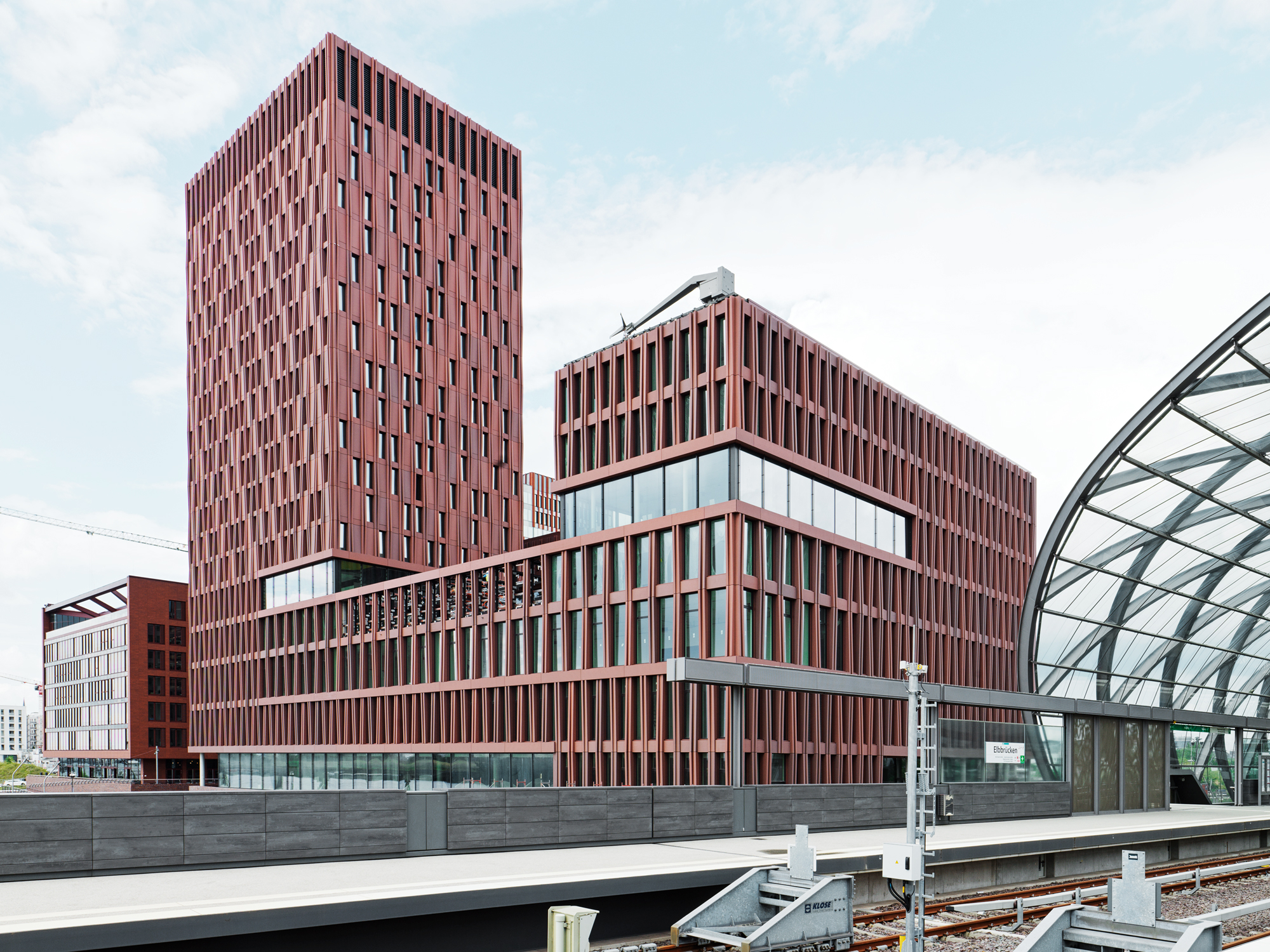 Direkt an der Elbe prägt das Präventionszentrum PREVIER die Hamburger HafenCity als monolithische Großskulptur. Der 18-geschossige Turm mit Sockelbau von Auer Weber besticht durch eine warm abgestufte, steinähnliche Fassade aus Glasfaserbeton: über 2.645 vertikale Lisenen, 2.500 horizontale Brüstungsprofile und rund 1.500 m² Platten in sechs eigens entwickelten Rotnuancen schaffen ein modernes Ziegel-Zitat und symbolisieren Schutz, Sicherheit und einladende Architektur.